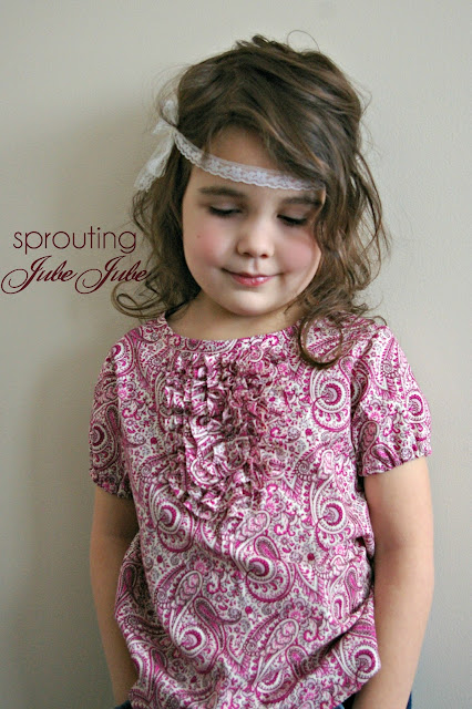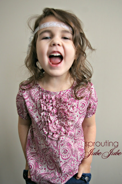 Camelot fabrics. You do see Amelia here in the photos (the joy of having two girls the same size) only because JubeJube is in school, but JubeJube does love her new blouse. Now to get it off Amelia, I guess I'll be needing to make another.