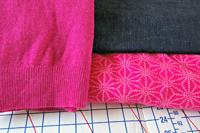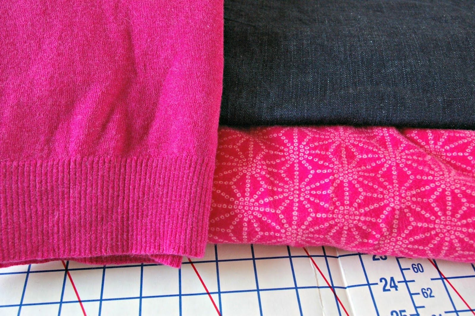 These are the fabrics that I'll be using. A heavier denim for the outside, soft cotton flannel for the lining and I'm going to upcyle a knit sweater and use the ribbing for the cuffs, neckband welted pockets. This is going to be one sweet looking jacket!